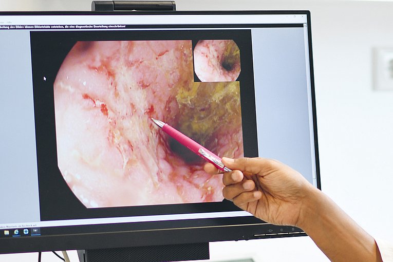 Im DZI wird die chronische Entzündung im Darm mithilfe verschiedener Bildgebungsverfahren nachgewiesen, etwa mit Ultraschall oder der Magnetresonanztomografie (MRT). Hochauflösende Endomikroskope vergrößern die Darmschleimhaut um das 1.000-Fache und ersparen den Betroffenen manchmal sogar Gewebeproben. Die moderne molekulare Endoskopie erlaubt sogar eine Therapieprognose: Dabei machen die Ärztinnen und Ärzte die Zellen der Darmschleimhaut sichtbar und beurteilen, ob und wie gut sie auf ein bestimmtes Medikament ansprechen. Seit Kurzem nutzen die Erlanger Gastroenterologinnen und Gastroenterologen zudem die Multispektrale Optoakustische Tomografie (MSOT): Dabei durchleuchten sie den Darm durch die Haut hindurch mit einem Laser. Das absorbierte Licht wird in ein Ultraschallsignal umgewandelt, das sensible Detektoren aufnehmen und als Bild ausgeben. „Die Methode ist nicht-invasiv und geht schnell. Die Patientin beziehungsweise der Patient muss kein Abführmittel trinken, und Entzündungen werden auch damit zuverlässig erkannt“, erklärt Raja Atreya.