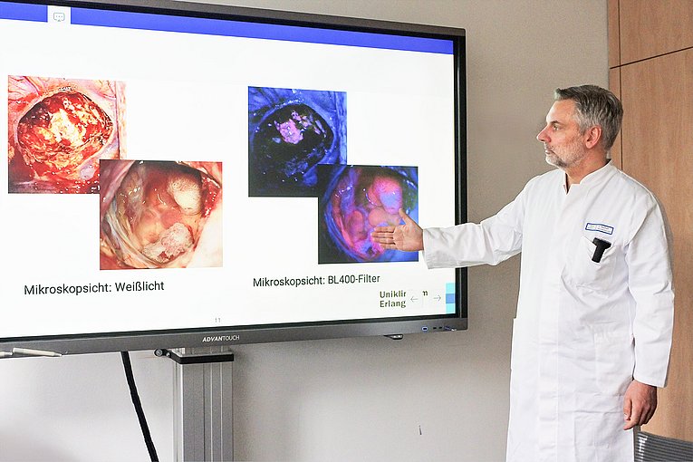 Eine Methode, die der neue Klinikdirektor in Erlangen eingeführt hat, ist die 5-ALA-Fluoreszenz-Mikroskopie. Ein vor dem Eingriff getrunkenes Medikament reichert sich dabei in Krebszellen an und lässt sie unter dem OP-Mikroskop rot-violett leuchten. So sind sie besser sichtbar und von gesundem Gewebe gut zu unterscheiden. Manchmal wird auch ein Stück verdächtiges Hirngewebe entnommen, um es genauer zu untersuchen. Diese Histologie geschieht normalerweise in der Neuropathologie: Hier wird die Probe in Paraffin gebettet, mikrometerdünn geschnitten, auf einen gläsernen Objektträger aufgebracht, eingefärbt und unter dem Mikroskop beurteilt. Bis das Ergebnis dieses Schnellschnitts im OP ankommt, vergehen mindestens 20 Minuten. Die Alternative: „Mit einem Laser machen wir aus der Probe noch im OP eine digitale Histologie. Die Art, wie das Laserlicht mit den Molekülen im Gewebe interagiert, verrät nämlich etwas über dessen Zusammensetzung. Diese Methode dauert nur fünf Minuten“, sagt Prof. Schnell. „Studien haben gezeigt, dass beide Histologieverfahren – das klassische und das digitale – hohe Übereinstimmungen haben. Wir wollen die neue Variante deshalb intensiver diagnostisch nutzen.“