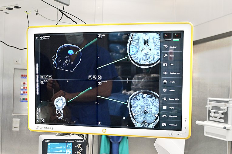 Um Veränderungen im Gewebe zu beurteilen, können Neurochirurginnen und -chirurgen Ultraschall-, CT-, MRT- und PET-Bilder miteinander kombinieren. Wenn sie die Aufnahmen übereinanderlegen, sehen sie, wo der Tumor genau liegt, wie aggressiv er ist, wie schnell oder langsam er wächst und wo Proben genommen werden sollten. Auch bewegungs- und sprachrelevante Areale und Faserbahnen können sich die Ärztinnen und Ärzte in der OP-Planung vorab farbig kennzeichnen. So finden sie immer den kürzesten und sichersten Weg zum Tumor. Während eines Eingriffs blendet das OP-Team dann millimetergenaue Markierungen über dem Operationsfeld ein und kennzeichnet mit dieser Neuronavigation, wo die Schnittlinien verlaufen sollen. „Zusätzlich haben wir in Erlangen den Vorteil, dass wir MRT- und Ultraschallaufnahmen unmittelbar während eines Eingriffs erstellen können“, erläutert Prof. Schnell. „Wir erfahren also in Echtzeit, ob es noch Tumorreste gibt, die wir entfernen müssen.“ Mittels Neuromonitoring überwacht das OP-Team wichtige Nervenfunktionen. „Es gibt beispielsweise einen Sauger, mit dem wir den zerkleinerten Tumor herausholen. Das Gerät warnt uns per Audiosignal davor, weiter ins Gewebe vorzudringen, wenn direkt daneben ein Funktionsareal liegt. So schützen wir den Patienten vor Funktionseinschränkungen – etwa vor einem Sprachverlust oder einer Halbseitenlähmung“, beschreibt Prof. Schnell.