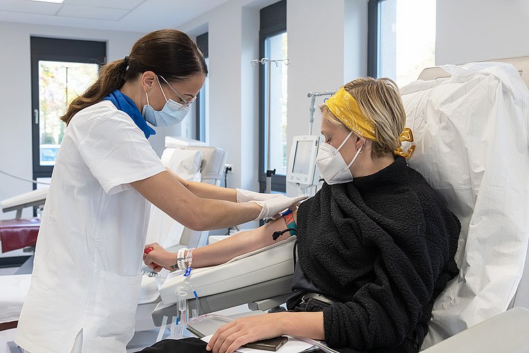 In der Ambulanz wird Gerinnungspatientinnen und -patienten Blut für weitere Untersuchungen abgenommen. „Außerdem machen wir hier Aderlasstherapien bei Menschen, deren Eisenspeicher übervoll sind“, sagt Dr. Achenbach. „Indem wir ihnen regelmäßig Blut abnehmen, entfernen wir auch das Eisen aus ihrem Körper. Ziel ist es, so ihre Werte zu normalisieren.“ Eine weitere Behandlungsoption für Schwerkranke sind Stammzellen. Die Oberärztin erklärt: „Patientinnen und Patienten können die Stammzellen zum einen für sich selbst spenden. Diese werden in unserer benachbarten Stammzellbank in flüssigem Stickstoff tiefgefroren und der Patientin oder dem Patienten dann zum Beispiel nach einer hochdosierten Chemotherapie zurückgegeben. Zum anderen entnehmen wir auch Blutstammzellen von gesunden Spenderinnen und Spendern für deren Angehörige. Bei den Erkrankten sollen die fremden Stammzellen dann im Knochenmark anwachsen und dort neue Blutzellen bilden.“