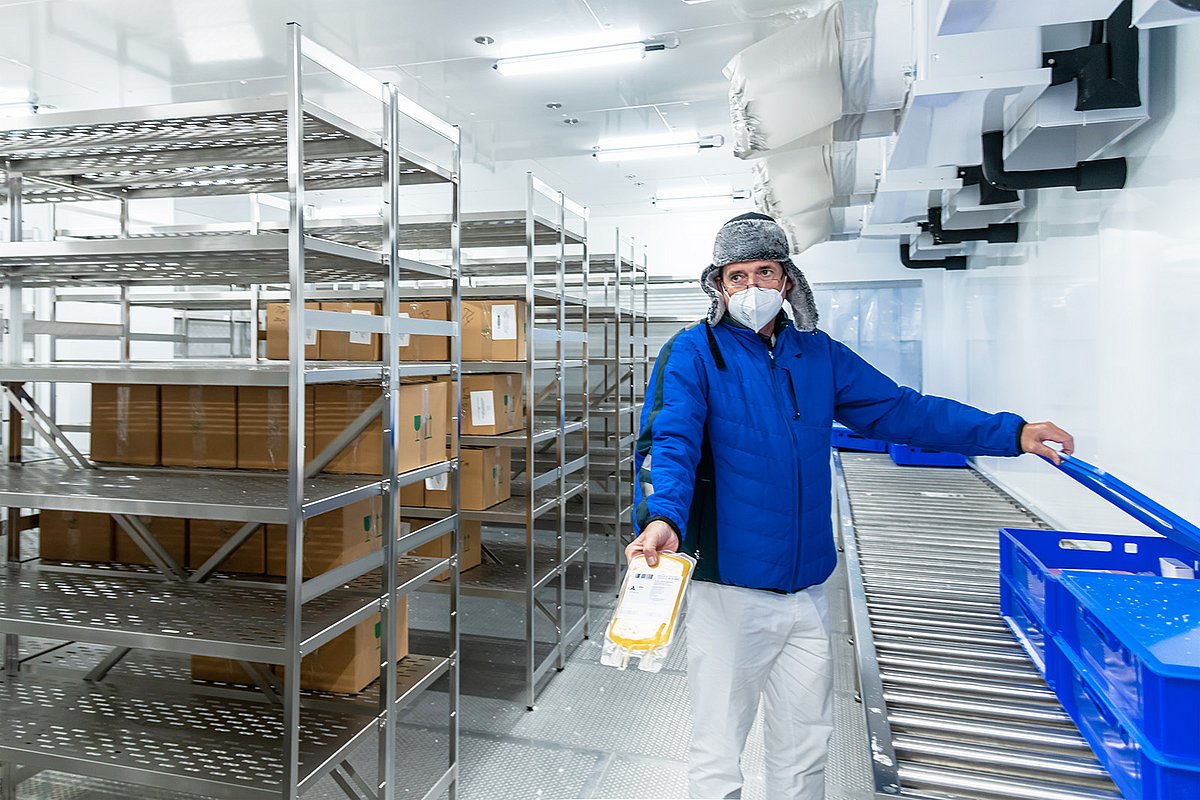 „Das ist unsere Antarktis.“ Pflegefachkraft Jens Schriewer zieht sich eine warme, blaue Jacke über und nimmt sich eine Mütze vom Kleiderhaken – eine mit dickem Fell und großen, wärmenden Ohrenklappen. „Wir müssen da zügig reingehen, damit nicht unnötig viel Wärme in den Raum kommt“, erklärt er. „Sonst ist das wie bei Ihrem Tiefkühlschrank zu Hause: Wenn der zu lange offen bleibt, vereist er.“ In dem Kühlraum im Untergeschoss der Hartmannstraße 14 herrschen −35 °C. Hier lagert das Blutplasma von Spenderinnen und Spendern des Uniklinikums Erlangen – ein wertvolles Gut, das bis heute kein Labor der Welt künstlich erzeugen kann. Aus dem Plasma stellt die Pharmaindustrie Medikamente her. „Einmal im Monat kommt ein Lkw, um es abzuholen“, sagt Jens Schriewer und hält eine hellgelbe Konserve in die Kamera. Im Schockfroster wurden die Beutel bei −50 °C zu festen Platten zusammengepresst. Plasma enthält Gerinnungsfaktoren, die z. B. Menschen dringend brauchen, die an der Bluterkrankheit (Hämophilie) oder am Von-Willebrand-Syndrom leiden. Letzteres zeigt sich u. a. durch häufiges Nasenbluten, eine starke Regelblutung oder auffallend viele blaue Flecken auf der Haut.