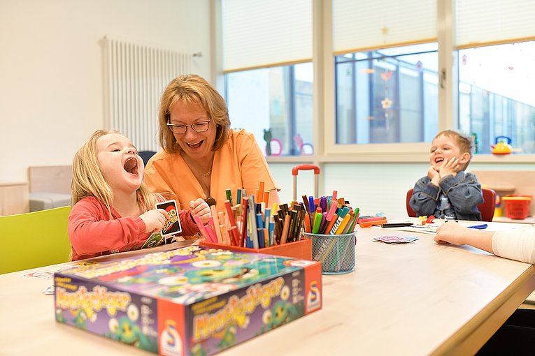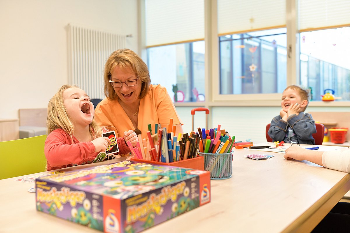 Zwei Tage nach der Bastelaktion treffen sich alle, die Lust haben und sich fit genug fühlen, mit Iris Hoseus im Gruppenzimmer. Hier wird von Montag bis Freitag gespielt, gebaut und kreativ gestaltet. Auch die dreijährige Ella ist heute dabei. Seit einem Jahr hat sie Epilepsie. „Heute Nacht ging es wieder los und morgens hatte sie schon mehrere Anfälle“, berichtet ihre Mutter, die bei ihrer Tochter auf Station schläft und sehr müde aussieht. „Sie kriegt jetzt andere Medikamente und muss so lange bleiben, bis es besser ist.“ Dass Ella heute mit Jakob, Paul und Anasthasia im Gruppenzimmer sein darf, ist nicht selbstverständlich. „Sie wird von den Medikamenten immer etwas benommen, aber der Arzt hat gesagt, sie soll mal raus – im Zimmer kriegt sie einen Koller“, so die Mutter. Die Kinder entscheiden sich für eine Runde UNO Extreme mit Iris Hoseus: Hat man Glück, passiert nichts. Hat man Pech, spuckt die „Zufallsschleuder“ auf Knopfdruck eine ganze Flut von Karten aus. Als genau das bei Ella passiert, wirft sie ihren Kopf in den Nacken, lacht laut auf und steckt damit alle anderen am Tisch an. Die Erzieherin hilft der Kleinen, alle Karten einzusammeln und sagt: „Wir geben den Kindern hier ein bisschen Normalität und Lebensfreude, unter anderem im Spiel. Hier können sie auch mal Zeit ohne die Eltern verbringen, sich mit uns oder mit Gleichaltrigen austauschen. Auch die Geschwister sind hier willkommen.“ Weiter geht es mit dem Spiel Kroko Doc: Wer traut sich, dem Krokodil ins Maul zu greifen, um seinen kranken Zahn zu finden? Vorsicht: Es kann jederzeit zuschnappen! Voller Spannung geht es reihum, Zahn für Zahn wird heruntergedrückt und die Kinder rutschen feixend auf ihren Stühlen herum, wenn Kroko sie einmal mehr verschont hat. Vertrauensvoll legt jetzt der zweijährige Paul seinen Finger auf den von Iris Hoseus – sie soll den nächsten Zahn drücken. Gemeinschaftliches Augenzusammenkneifen. Uff – geschafft, nichts passiert!