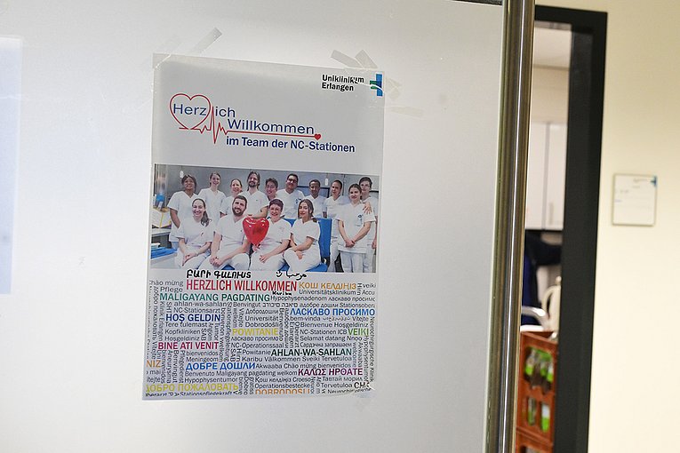 „Auch wir lernen von den internationalen Pflegefachkräften“, berichtet Marc Reinhold und hebt hervor: „Sie haben ein enormes Fachwissen, egal ob in Anatomie, Pharmakologie oder Therapie. Sie haben alle studiert, in Deutschland machen wir stattdessen eine Berufsausbildung. Wir arbeiten dafür sehr nah am Patienten, waschen, beobachten, lagern und mobilisieren, wechseln Verbände – das machen in vielen anderen Ländern die Angehörigen.“ Es ist spürbar, dass das Team der Station 32 einen angstfreien, offenen Raum geschaffen hat, in dem neue Mitarbeitende ganz allmählich ankommen können. Natürlich sei die Sprache, vor allem das Fränkische, anfangs herausfordernd. Und „Hock dich hi“ steht nun mal in keinem Wörterbuch. Gute Deutschkenntnisse sind Voraussetzung für eine Einstellung am Uniklinikum Erlangen. Dazu bekommen alle ausländischen Pflegefachkräfte einen vierwöchigen Intensiv-Sprachkurs, bevor sie überhaupt auf Station anfangen. Danach geht das Deutschlernen berufsbegleitend weiter. Doch auch Mimik und Gestik können interkulturelle Hürden sein. So erlebte es auch Shency Mol Baby aus Indien, die seit Sommer 2024 auf Station 32 arbeitet. Marc Reinhold im Gespräch in die Augen zu sehen, war für die 35-Jährige anfangs schwer. „In Indien tun wir das nicht – aus Respekt, gerade vor Vorgesetzten“, erklärt sie. In Deutschland gilt es wiederum als unhöflich, jemanden beim Sprechen nicht anzuschauen. Erlebt man Shency Mol Baby heute, neun Monate nach ihrem Start in Europa, glaubt man kaum, dass ihr der Blickkontakt einmal schwerfiel. Dass Deutsche krankenversichert sind und dass hier grundsätzlich alle behandelt werden – egal, wie viel Geld sie haben –, findet die junge Frau toll, denn in ihrer Heimat kann nur versorgt werden, wer es sich leisten kann.