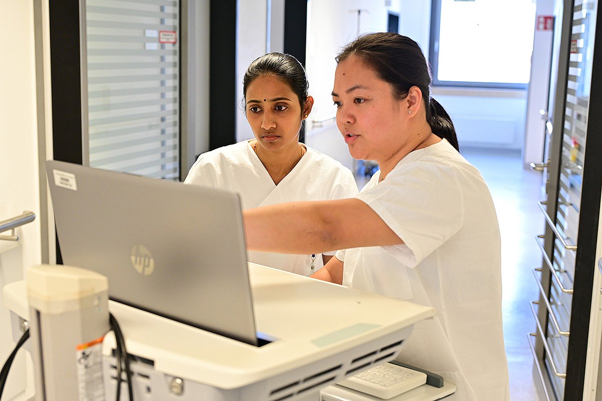 „Auch wir lernen von den internationalen Pflegefachkräften“, berichtet Marc Reinhold und hebt hervor: „Sie haben ein enormes Fachwissen, egal ob in Anatomie, Pharmakologie oder Therapie. Sie haben alle studiert, in Deutschland machen wir stattdessen eine Berufsausbildung. Wir arbeiten dafür sehr nah am Patienten, waschen, beobachten, lagern und mobilisieren, wechseln Verbände – das machen in vielen anderen Ländern die Angehörigen.“ Es ist spürbar, dass das Team der Station 32 einen angstfreien, offenen Raum geschaffen hat, in dem neue Mitarbeitende ganz allmählich ankommen können. Natürlich sei die Sprache, vor allem das Fränkische, anfangs herausfordernd. Und „Hock dich hi“ steht nun mal in keinem Wörterbuch. Gute Deutschkenntnisse sind Voraussetzung für eine Einstellung am Uniklinikum Erlangen. Dazu bekommen alle ausländischen Pflegefachkräfte einen vierwöchigen Intensiv-Sprachkurs, bevor sie überhaupt auf Station anfangen. Danach geht das Deutschlernen berufsbegleitend weiter. Doch auch Mimik und Gestik können interkulturelle Hürden sein. So erlebte es auch Shency Mol Baby aus Indien, die seit Sommer 2024 auf Station 32 arbeitet. Marc Reinhold im Gespräch in die Augen zu sehen, war für die 35-Jährige anfangs schwer. „In Indien tun wir das nicht – aus Respekt, gerade vor Vorgesetzten“, erklärt sie. In Deutschland gilt es wiederum als unhöflich, jemanden beim Sprechen nicht anzuschauen. Erlebt man Shency Mol Baby heute, neun Monate nach ihrem Start in Europa, glaubt man kaum, dass ihr der Blickkontakt einmal schwerfiel. Dass Deutsche krankenversichert sind und dass hier grundsätzlich alle behandelt werden – egal, wie viel Geld sie haben –, findet die junge Frau toll, denn in ihrer Heimat kann nur versorgt werden, wer es sich leisten kann.