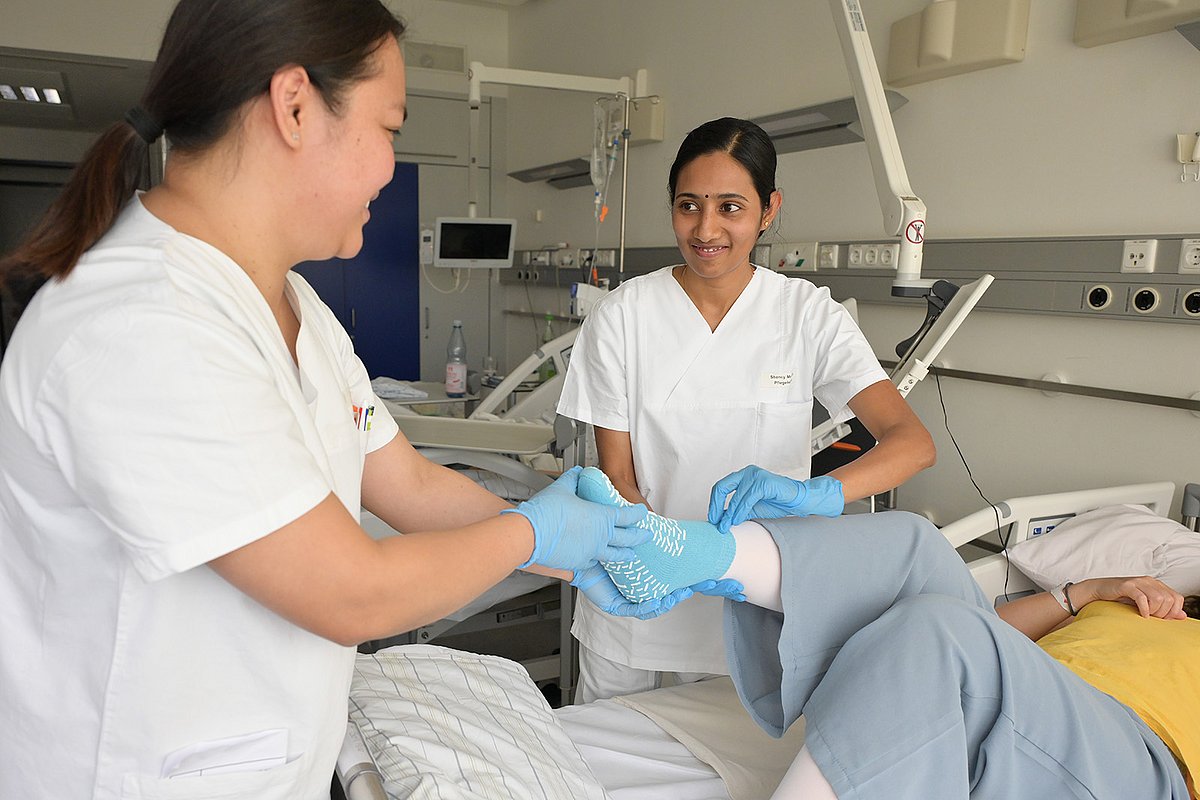 „Wir brauchen die Zuwanderung von Fachkräften unbedingt – ohne sie geht es nicht“, betont Tanja Hofmann, stellvertretende Pflegedirektorin des Uniklinikums Erlangen. „Unsere neurochirurgischen Stationen beispielsweise setzen deren Integration vorbildlich um.“ Laut Tanja Hofmann bleibt die internationale Pflege-Akquise weiterhin wichtiger Baustein der Personalgewinnung des Uniklinikums Erlangen, denn „der lokale Arbeitsmarkt ist leer und allein mit den Azubis unserer eigenen Pflegeschule decken wir unseren Bedarf nicht“, erläutert sie. Lena Kellner, Referentin der Pflegedirektion, gibt den Zugewanderten „Starthilfe“: Flughafenabholung, Vermittlung eines Wohnheimzimmers, Hilfe bei Behördengängen, Internetanschluss und SIM-Karte, Ikea-Haushalts-Starterkit und WhatsApp-Betreuung bei allen Alltagsfragen – von GEZ bis Steuer-ID. „Wir lernen seit 13 Jahren von Gruppe zu Gruppe dazu“, sagt Tanja Hofmann. „Während wir den ersten Tunesierinnen und Tunesiern noch ein Frühstück anboten, mitten im Fastenmonat Ramadan, und der philippinischen Gruppe die Fahrradstadt Erlangen anpriesen – ohne zu wissen, dass sie zum Teil noch nie in ihrem Leben Fahrrad gefahren waren –, werden wir von Mal zu Mal besser.“ Die Integration sei für alle – die Zugewanderten und die Stammteams vor Ort – „ein immenser Aufwand. Aber er ist nötig“, betont Tanja Hofmann noch einmal. Lena Kellner gibt zu bedenken: „Das sind Menschen, die ihr Leben in zwei Koffer gepackt haben. Die Familien, teilweise kleine Kinder, in ihrer Heimat zurücklassen, um hier neu anzufangen. Machen wir uns deshalb immer wieder bewusst, dass Pflegende auf der ganzen Welt letztlich dasselbe wollen: für andere da sein und Fürsorge geben.“