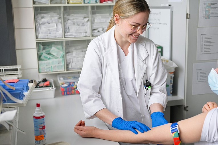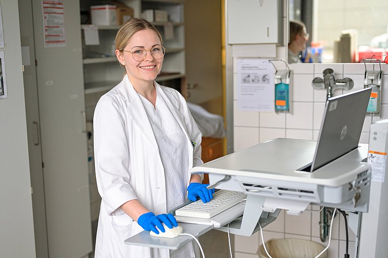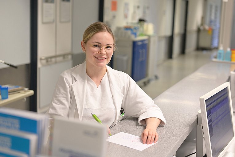 Doch warum sollte man PAs einstellen? „Die Ärztinnen und Ärzte sind mit den vielen anfallenden Aufgaben oft überlastet“, erklärt die PA. „Vor allem in der Neurochirurgie sind sie viel im OP und haben entsprechend weniger Zeit für die Arbeit auf Station. Hier komme ich ins Spiel, um sie zu entlasten.“ Larisa Leonova übernimmt delegierbare Aufgaben der Ärzteschaft, etwa Dokumentationen, die stationäre Aufnahme von Patientinnen und Patienten einschließlich körperlicher Untersuchung, Anamnese sowie Blutabnahmen. Auch eingenommene Medikamente pflegt die PA ins Klinische Arbeitsplatzsystem ein. „Ich habe viel Patientenkontakt, das gefällt mir sehr“, sagt die junge Frau lächelnd.
