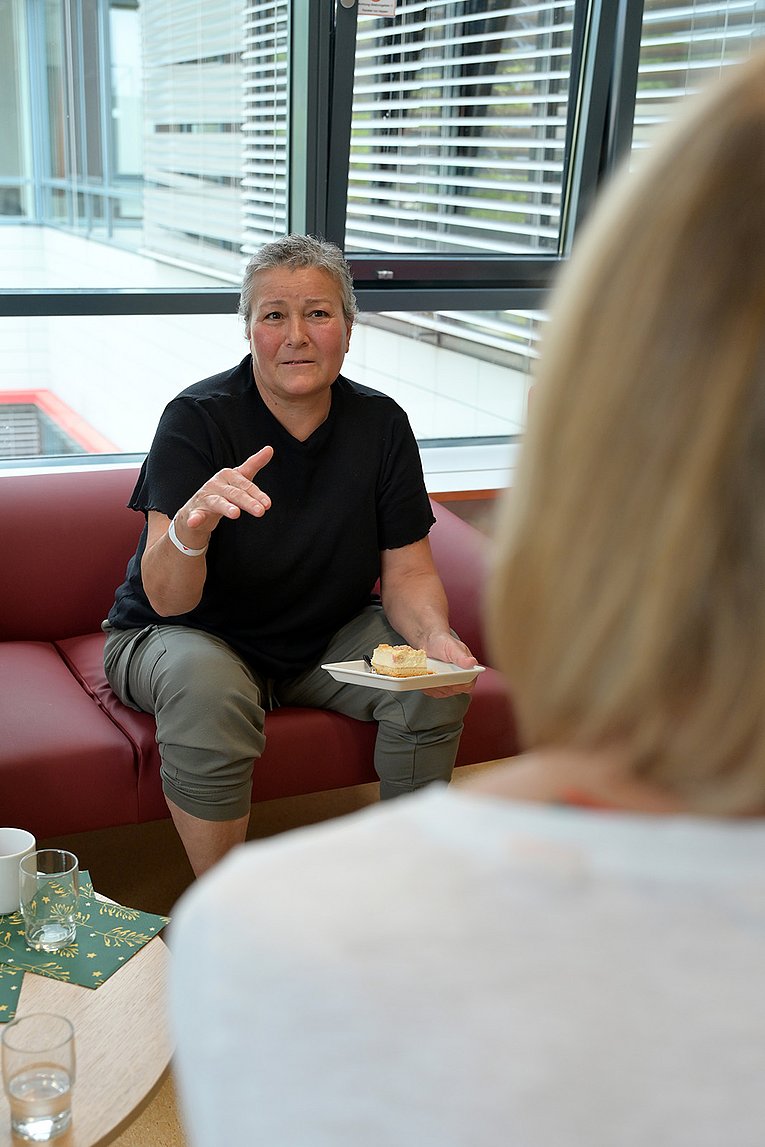 Plötzlich stößt eine Frau zur Runde hinzu. Dorothee Wolf, die auch heute wieder vor Ort ist, erkennt das Gesicht: „Hallo, Frau I., wie schön, Sie wiederzusehen!“, begrüßt sie die Patientin. „Setzen Sie sich doch, möchten Sie ein Stück Kuchen?“ Yadikar I. nickt freudig: „Hallo, Frau Wolf! Ja, sehr gern! Wie war Ihr Urlaub?“